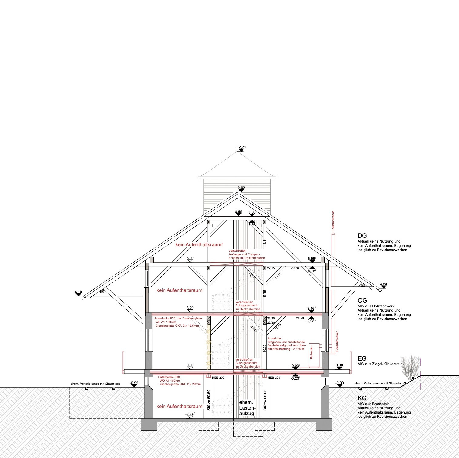 Problematische Eckpunkte bei der Planung waren brandschutztechnische Anforderungen. Eine Umnutzung ohne weitgreifende Maßnahmen und zugleich die Erhaltung der historischen Bausubstanz, welche im Großteil als brennbare Holzkonstruktion ausgeführt wurden, waren nur abweichend möglich.
