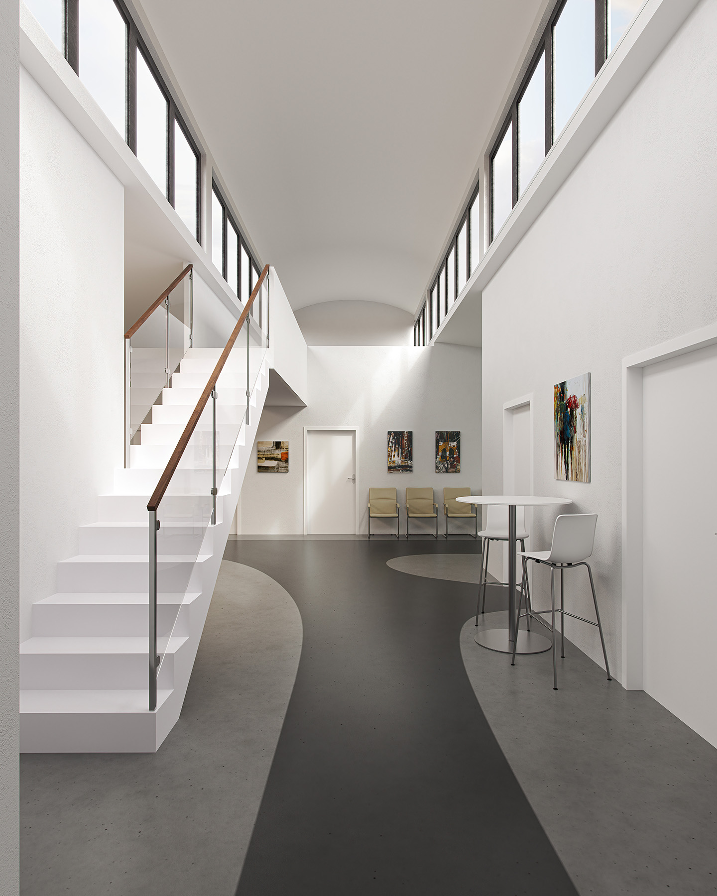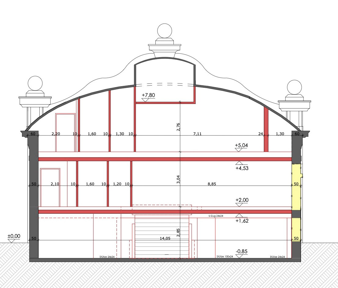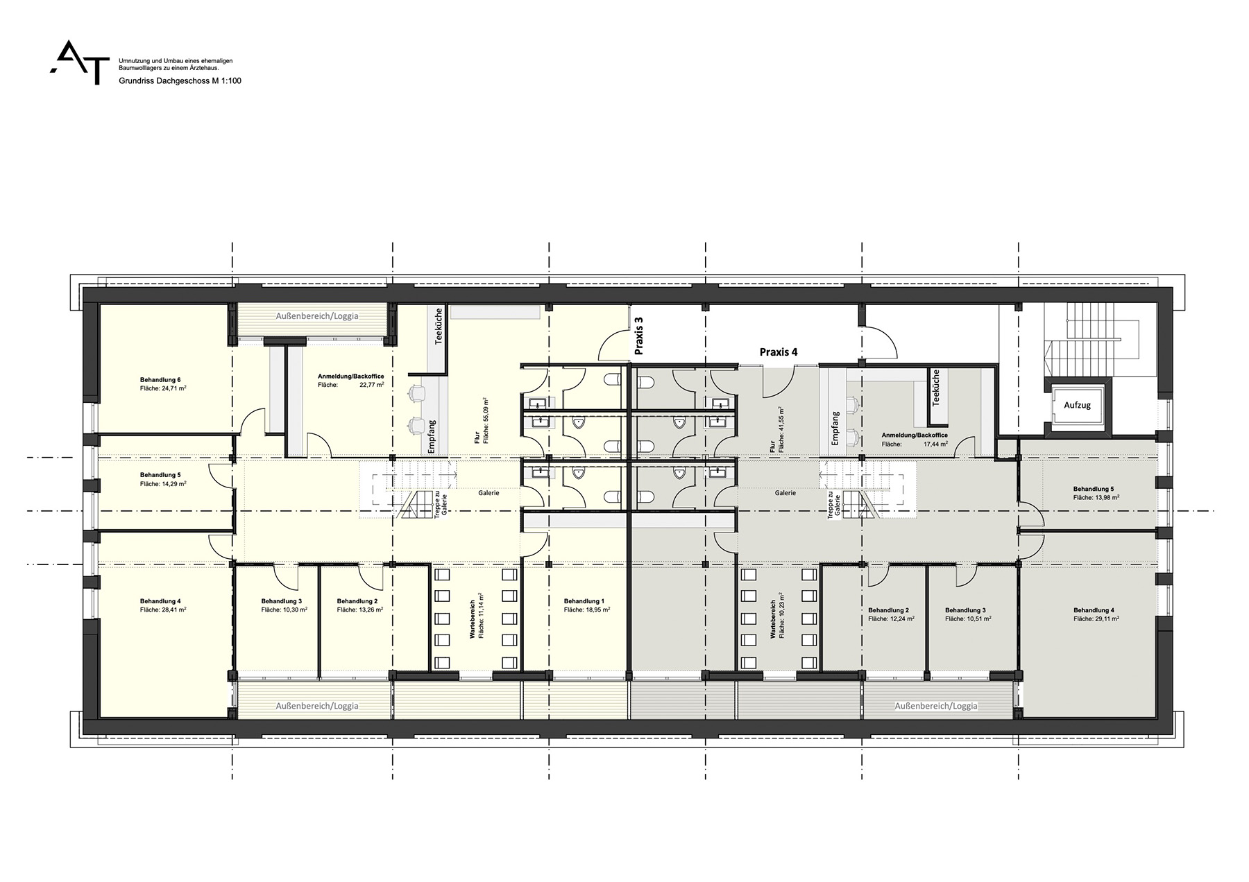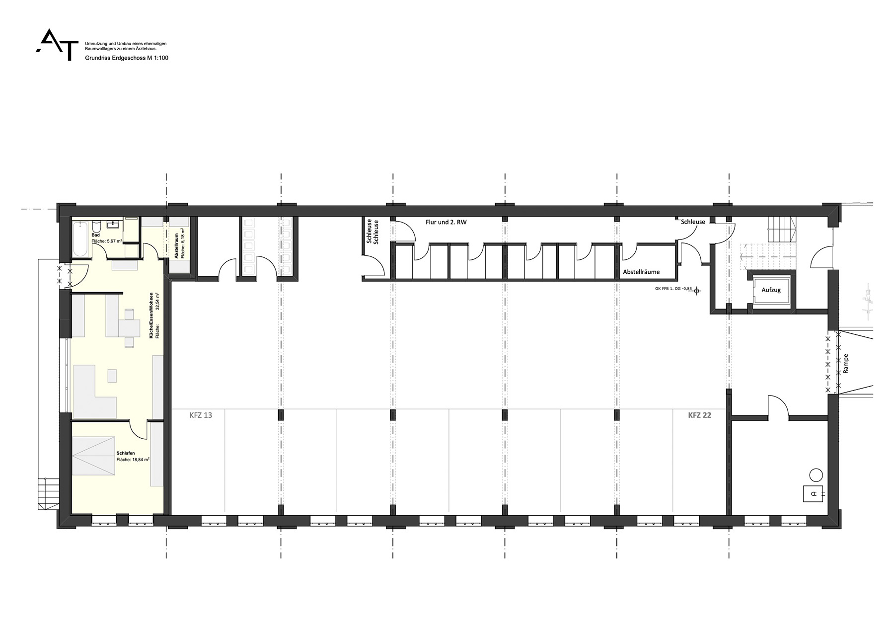 Das ehemalige Baumwolllager wurde 1904 für die Alte Spinnerei in Forchheim errichtet und wird im Zuge einer Umnutzung und Sanierung seiner neuen Bestimmung zugeführt. Das Backsteingebäude mit den geschwungenen Giebeln und dem markanten Glasdach wird umfassend saniert und neu strukturiert. Im hallenartigen Innenraum werden zwei Stahlbetondecken eingebaut. Im Erdgeschoss entstehen eine Mittelgarage und eine Wohnung. Im Ober- und Dachgeschoss sind jeweils zwei Arztpraxen vorgesehen.