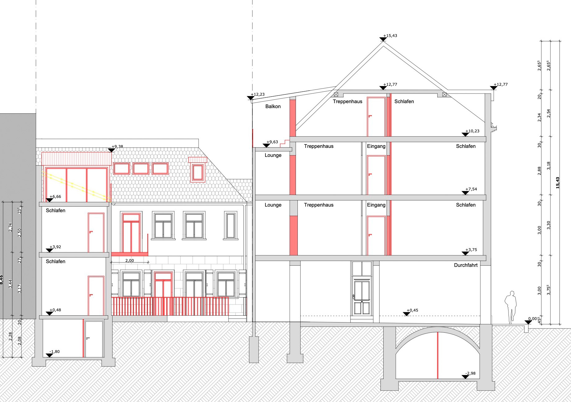 Auf der Rückseite des Hauptgebäudes wurden vorhandene Fensteröffnungen durch den Rückbau der vorhandenen Brüstungen als Terrassentüröffnungen erstellt. Diese dienen der Erschließung neu angebauter, rückseitiger Balkone. Es wurden auf allen Dächern die Dachdeckung mit Naturschieferdeckung (Spitzwinkeldeckung) ausgeführt; die zu flachen Bereiche für eine Schieferdeckung wurden mit einer 2-lagigen Bitumendeckung ausgeführt (auf den Gauben). Sämtliche Blecharbeiten wurden in Kupfer ausgeführt. Der hintere, zu späterer Zeit entstandene ehemalige Toilettenanbau an das Hauptgebäude wurde auf Erhaltungsfähigkeit geprüft und statisch ertüchtigt. Die senkrechte Boden-Leisten-Schalung wurde abgenommen und teilweise wiederverwendet; neue Verkleidungsbretter und -leisten wurden nach historischem Vorbild ergänzt.