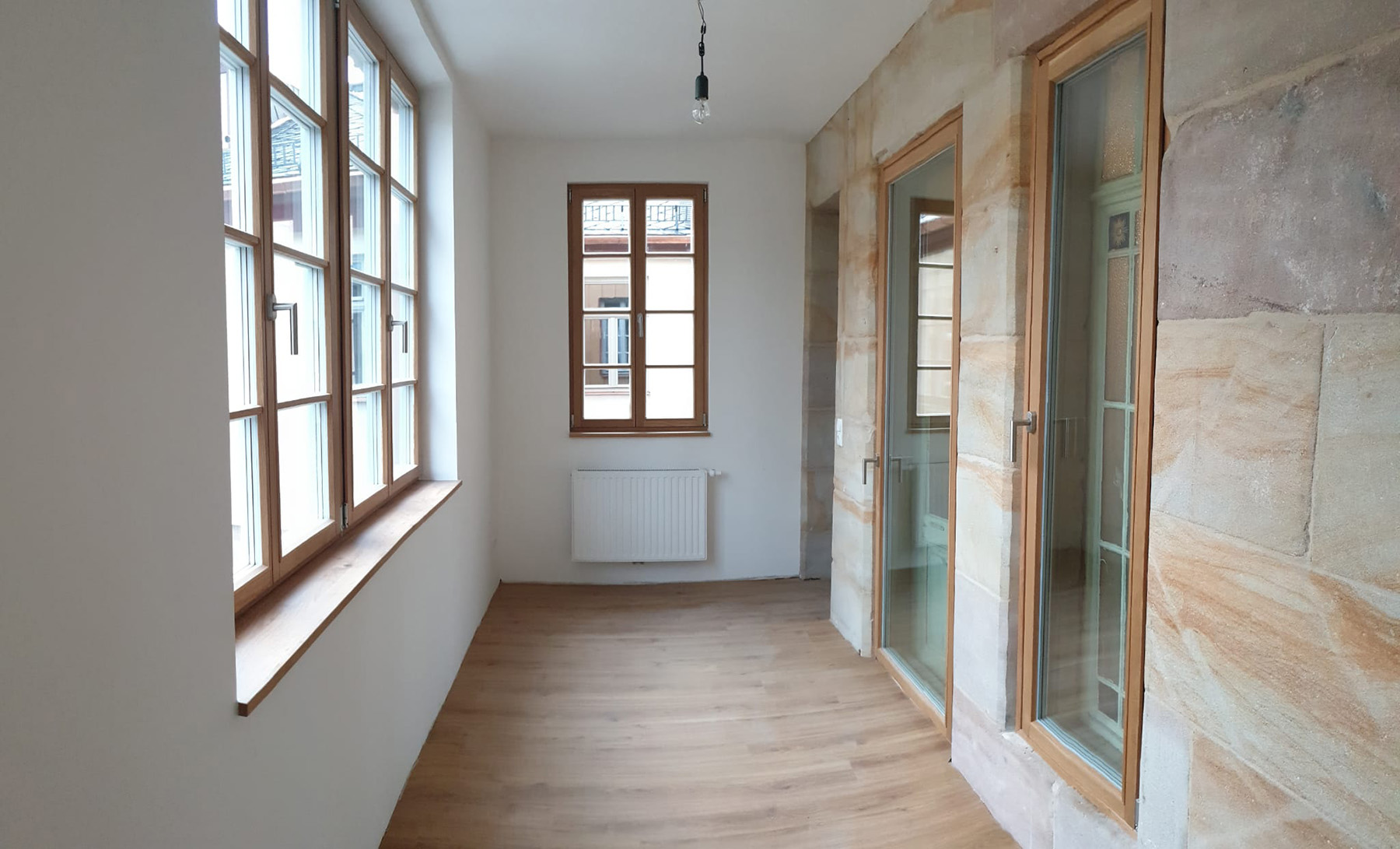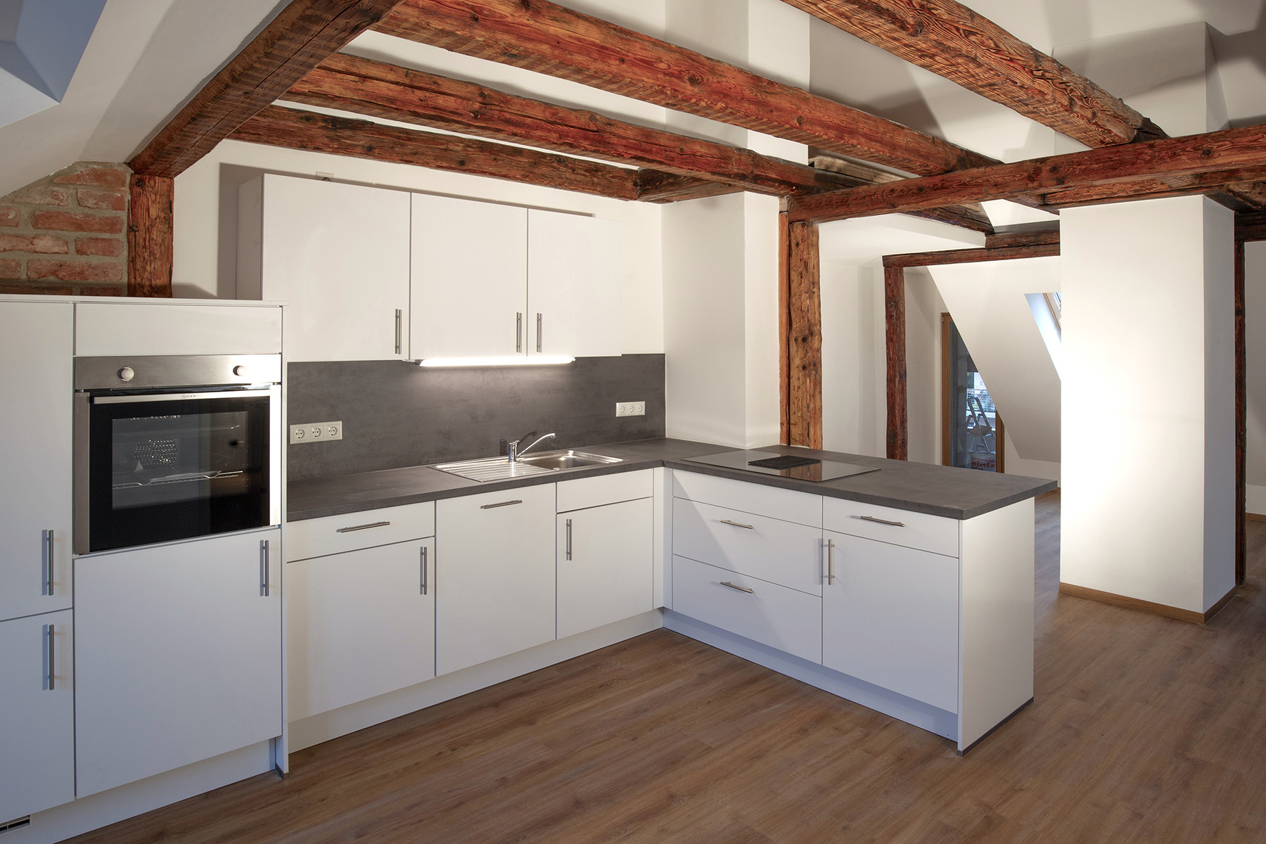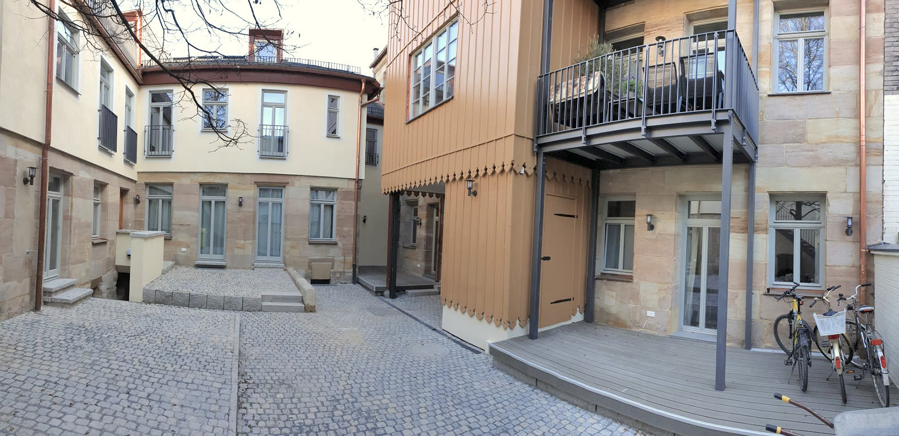 Die Farbegestaltung erfolgte nach Bemusterung und Absprache mit der USD-Behörde. Im Ganzen entstanden 10 Wohneinheiten in Vorder- und Rückgebäude mir einer Gesamtwohnfläche von ca. 820 m². Jede der Wohneinheiten ist mit einem Balkon, einer Terrasse oder einer Lounge zum Hof hin orientieret ausgestattet.