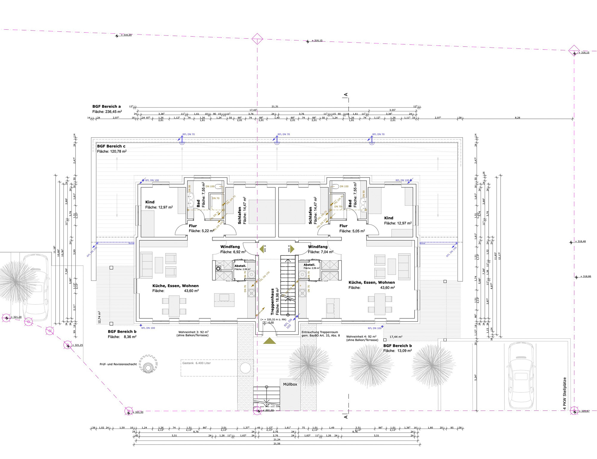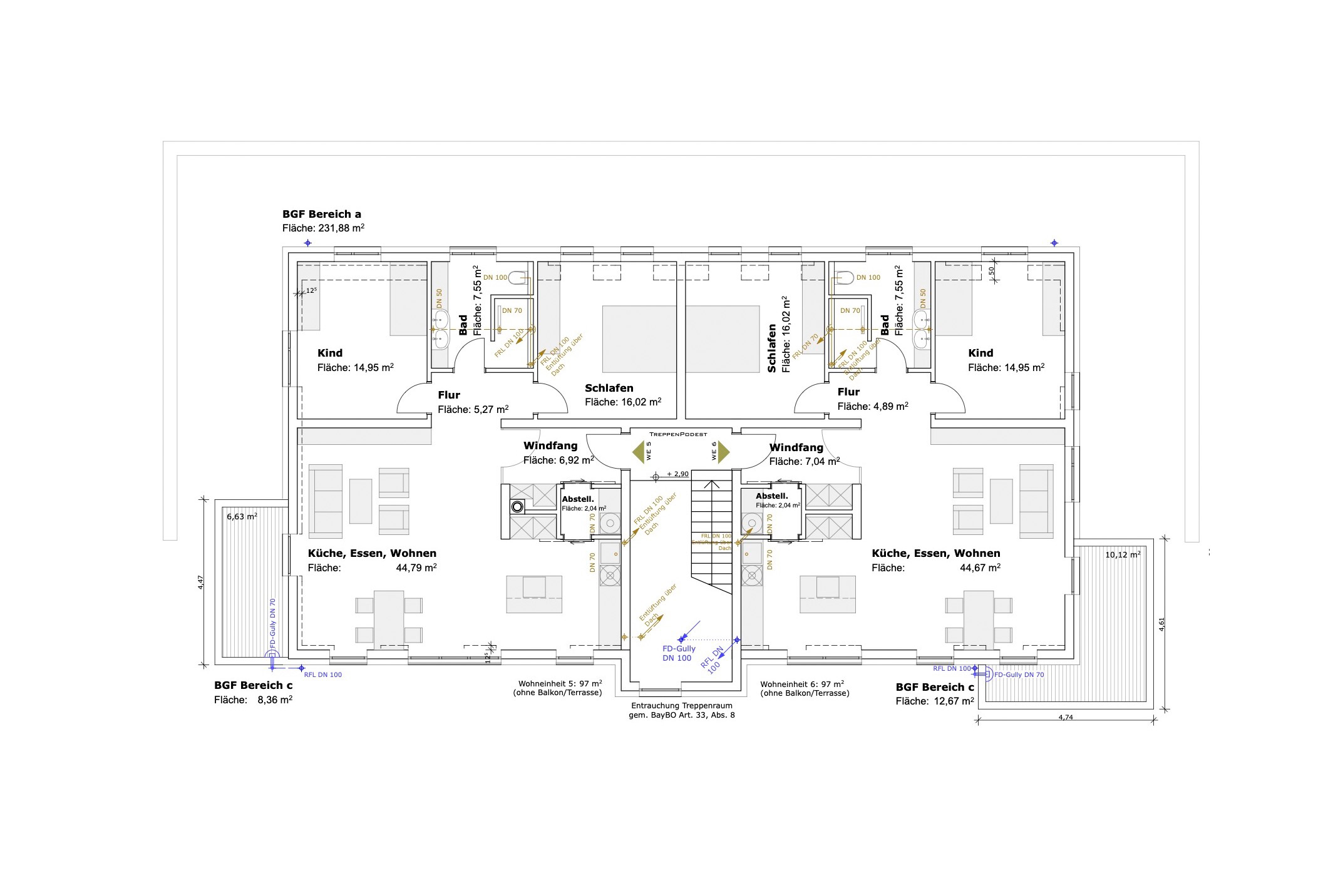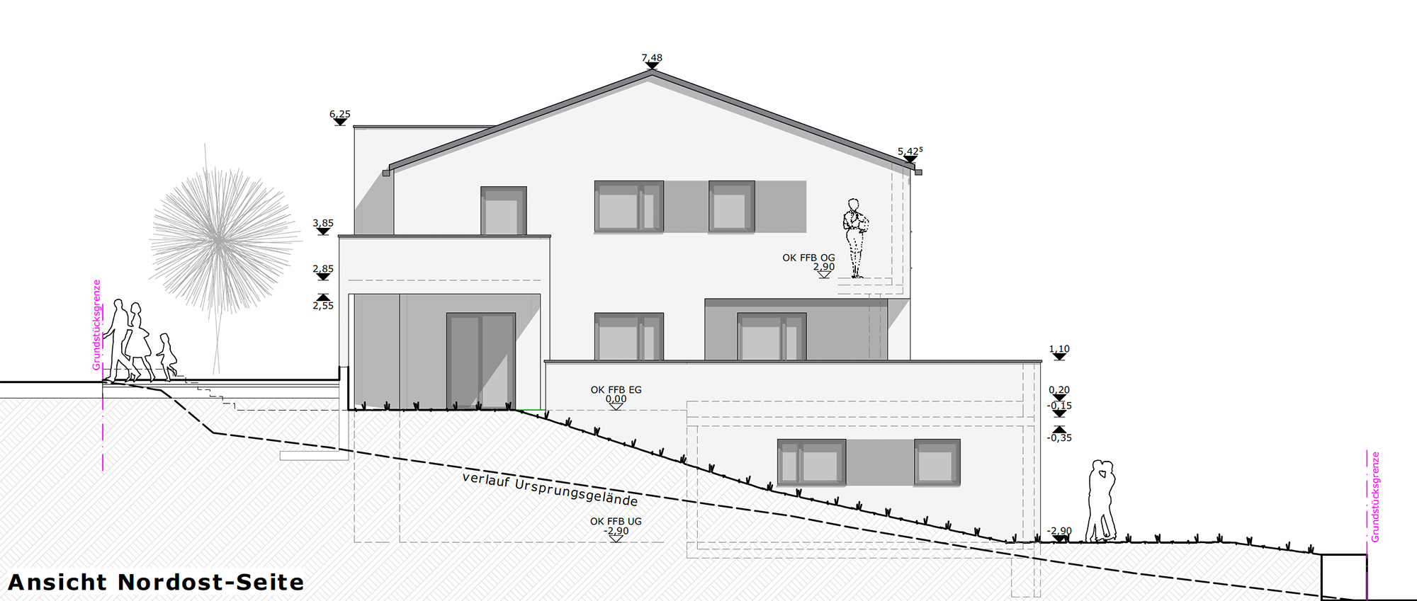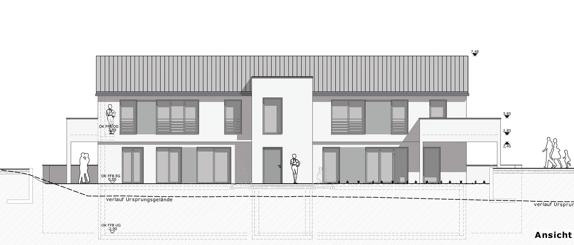 Neubau eines Mehrfamilienwohnhaus in Massivbauweise mit 6 Wohneinheiten. Die nicht unerhebliche Hangsituation ermöglichte die Nutzung des Untergeschosses als vollwertiges nutzbares Geschoss mit zwei Wohnungen. Die Wohnungsgrundrisse wurden mit offenen Küchen-, Essen- und Wohnbereichen gestaltet.