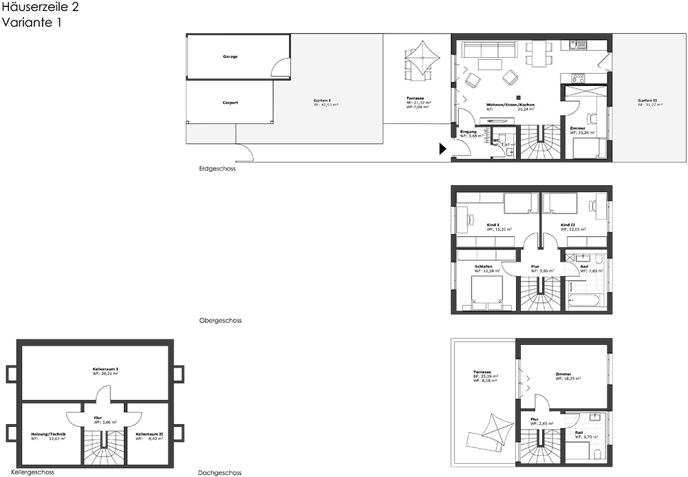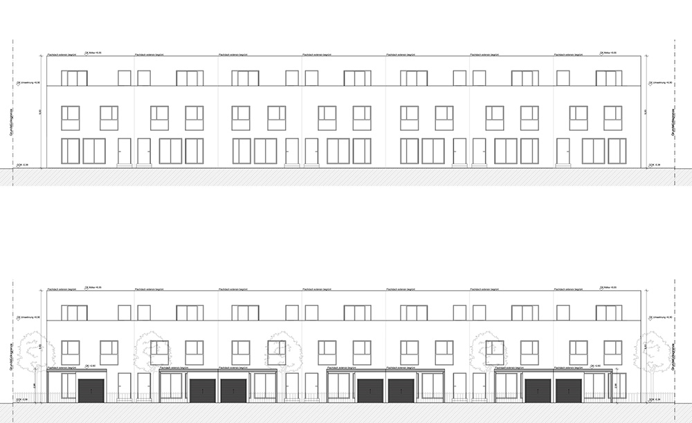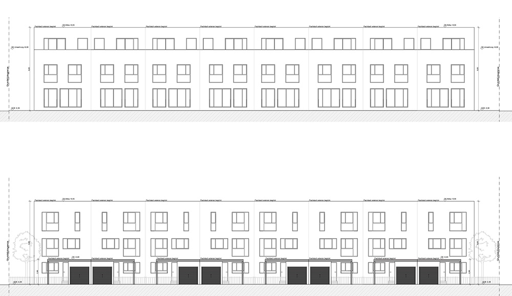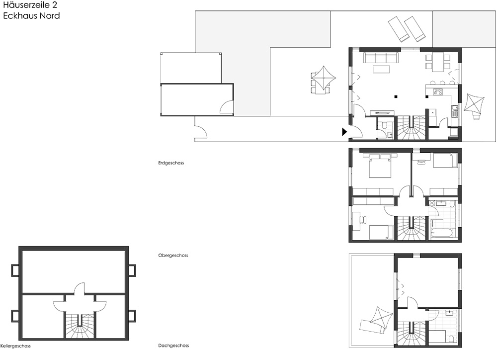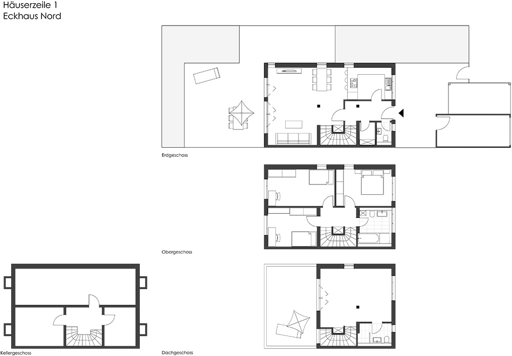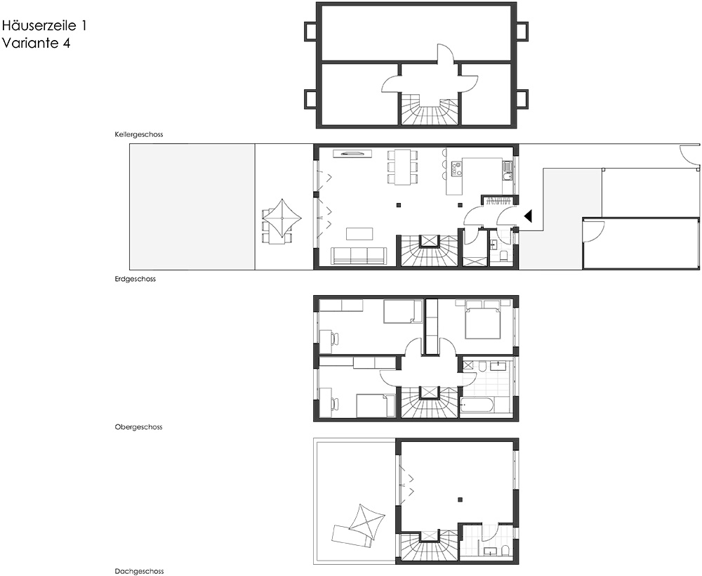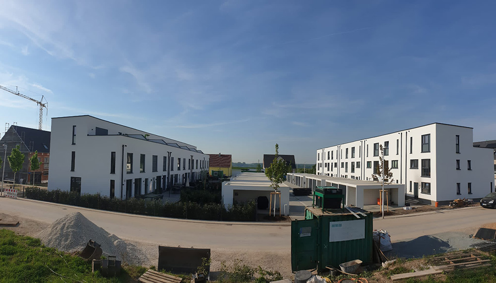 Im 3. Bauabschnitt des Wohngebietes Herzo Base, dem ehemaligen amerikanischen Kasernengelände nordöstlich von Herzogenaurach wurden Bereich des Grundstückspakets 27 16 Reihenhäuser in zwei Hauszeilen in Übereinstimmung mit dem Bebauungsplan Nr. 55 – 2./3. BA entworfen und gebaut. Die westorientieren Reihenhäuser sind jeweils vollunterkellert ab der Decke über dem Kellergeschoss in Holzrahmenbauweise (Energieeffizienzhaus-Standard 40) errichtet und weisen eine Wohnfläche von jeweils ca. 160 m² auf. Es handelt sich um dreigeschossige Flachdachgebäudezeilen mit jeweils zwei Vollgeschossen und einem zurückgesetzten Dachgeschoss mit Dachterrasse. Eine mittige Privatstraße verbindet und erschließt die jeweiligen Häuserzeilen.