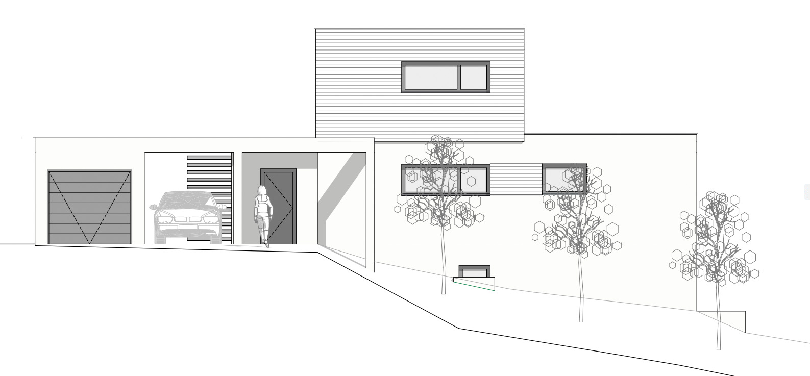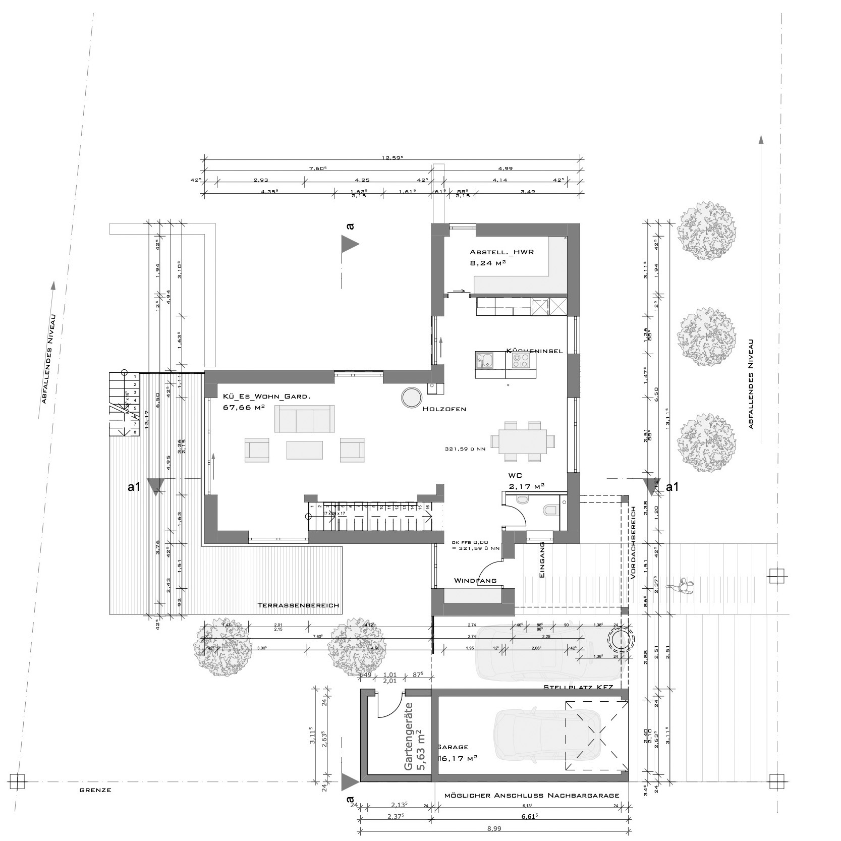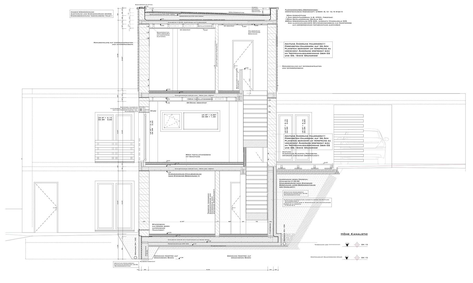 Das gesamte Untergeschoss im Hang wurde in Stahlbeton geplant. Die Erstellung von Erdgeschoss erfolgte in Massivbauweise (Porenbeton).