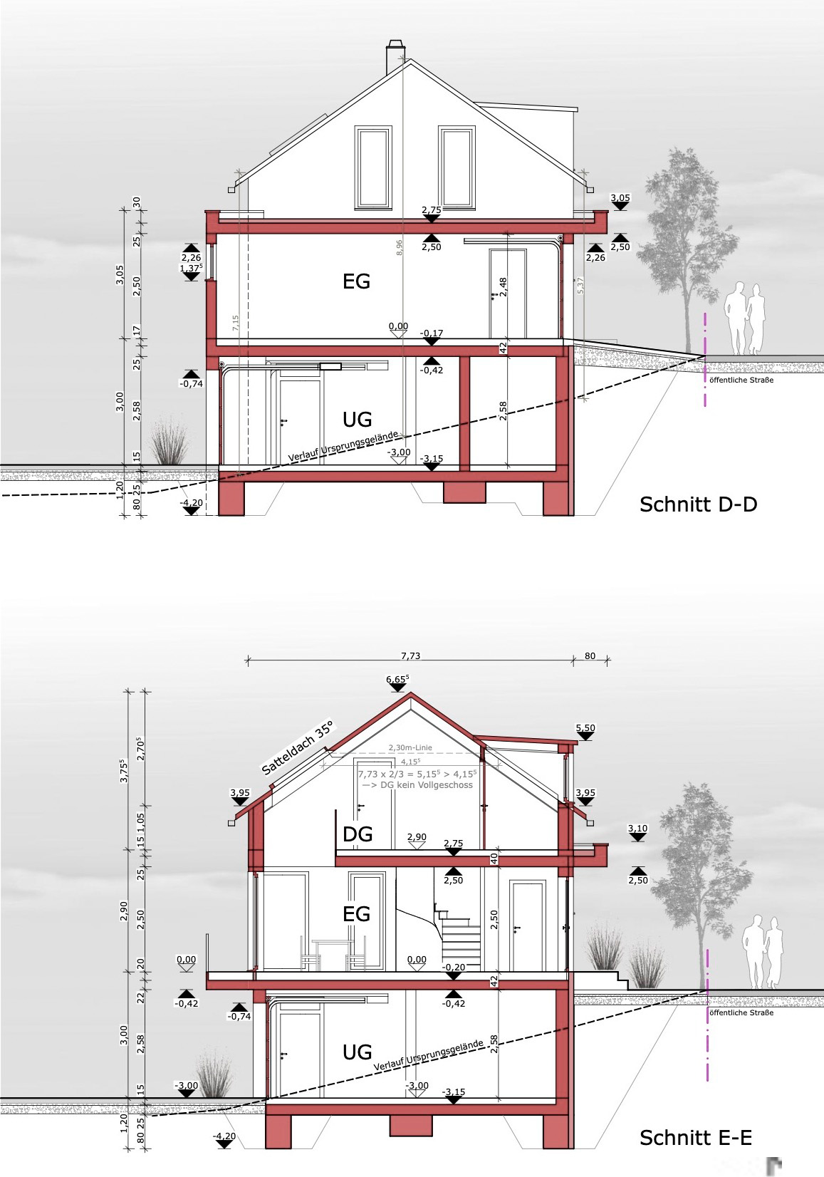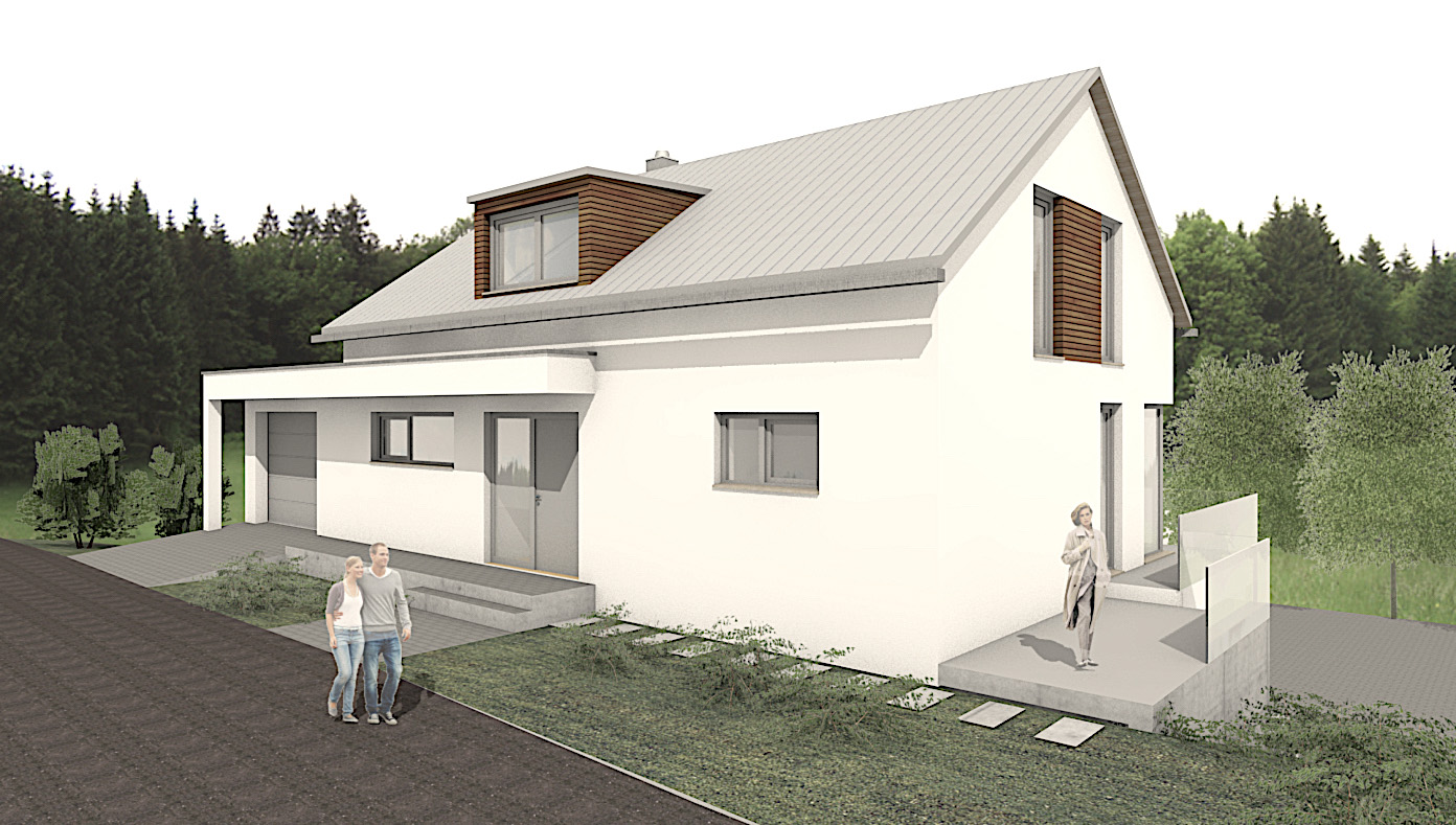 Das gesamte Untergeschoss im Hang wurde in Stahlbeton geplant. Die Erstellung von Erd- und Dachgeschoss erfolgte in Holzbau (Holzmassivmauerwerk).